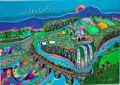 全体として、この絵は、私たちが幼い頃に思い描いた理想の風景や、心の中に存在するユートピアを具現化したかのようです。見るたびに新しい発見があり、心が満たされるような温かさと安らぎを感じさせてくれます。まさに、色彩と想像力が織りなす、至福の光景と言えるでしょう。この絵は、私たちに、世界はこんなにも美しく、そして創造に満ちているのだと教えてくれる、珠玉の作品です。