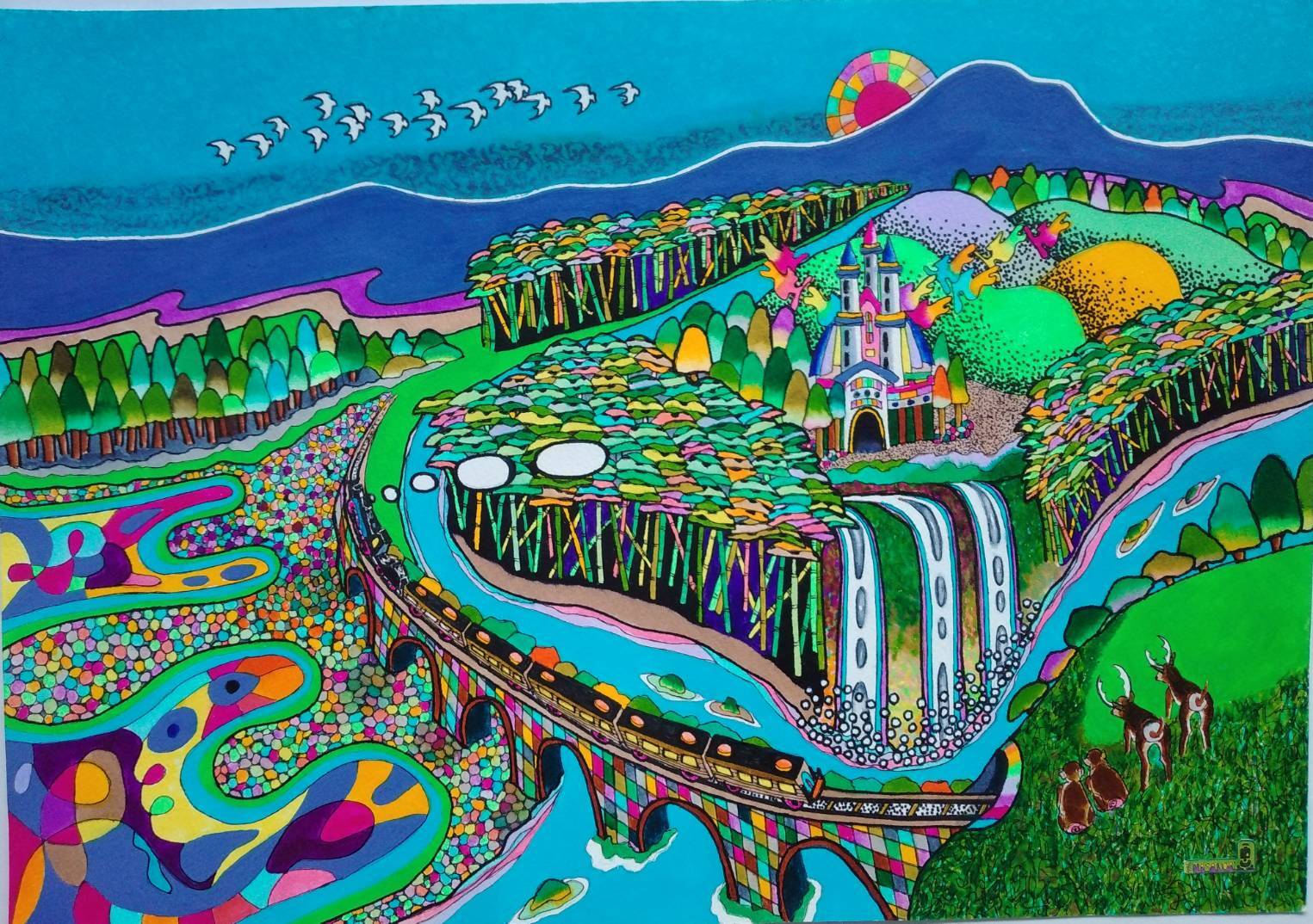 この作品は、非常に細部まで丁寧に描き込まれており、それぞれの部分が独立した小さなアートピースのようです。色の組み合わせや、点描、線描といった多様な表現技法が用いられており、作者の絵に対する愛情と、創造の喜びがひしひしと伝わってきます。それは、単に美しい風景を描くだけでなく、見る者の心にポジティブな感情を呼び起こし、日常の喧騒から解放してくれるような力を持っています。