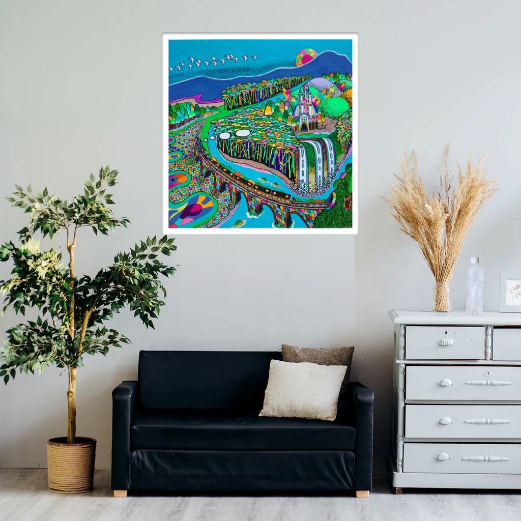 絵全体は、多様な要素が非常に緻密に、かつ遊び心いっぱいに配置されています。手前の色彩豊かな小道は、まるで宝石を敷き詰めたかのようにキラキラと輝き、見る者をその先に続く冒険へと誘っているようです。その小道が、流れる川やアーチ橋へと続き、画面全体に動きと奥行きを与えています。
